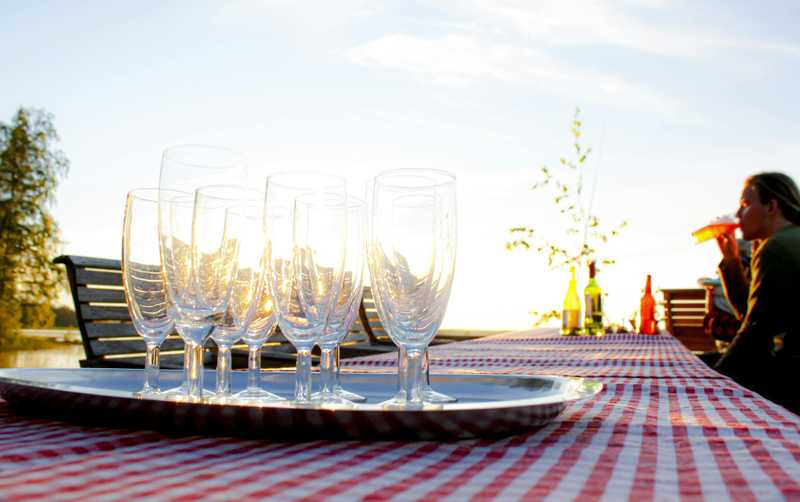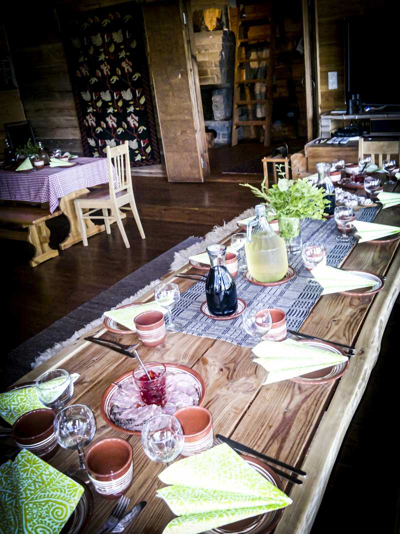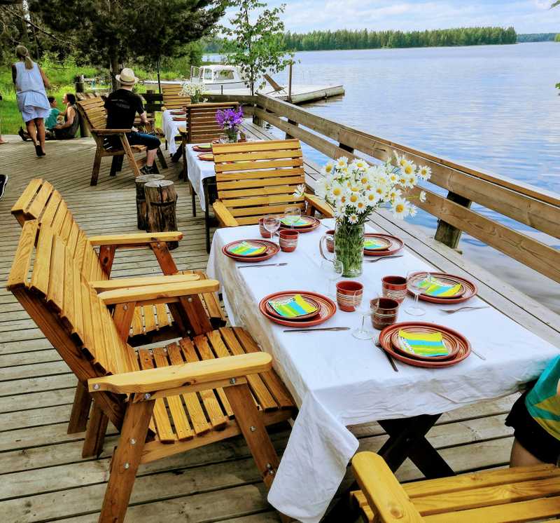 Tarjoilut voidaan hoitaa meidän puolesta, mutta asiakas voi halutessaan hoitaa tarjoilut myös itse - Savusaunarakennuksessa on keittiö, joka on ryhmän käytettävissä.